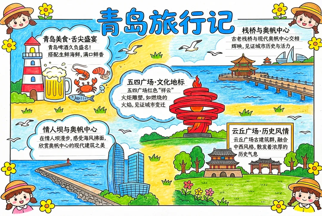 彩色卡通手绘青岛旅行记小报手抄报