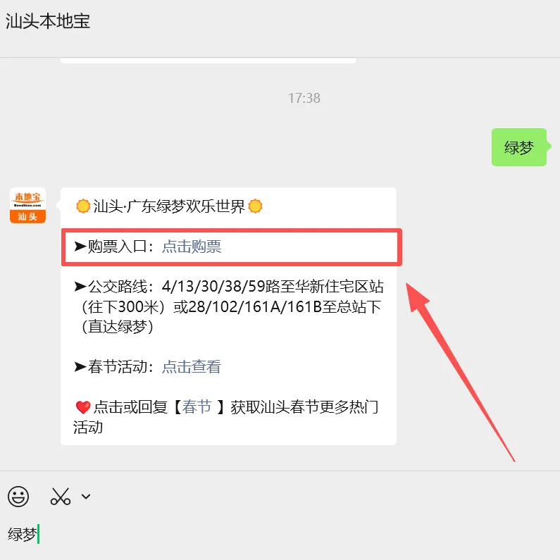 或长按下方二维码识别并关注公众号【汕头本地宝】聊天对话框回复【绿梦】即可获取购票入口。