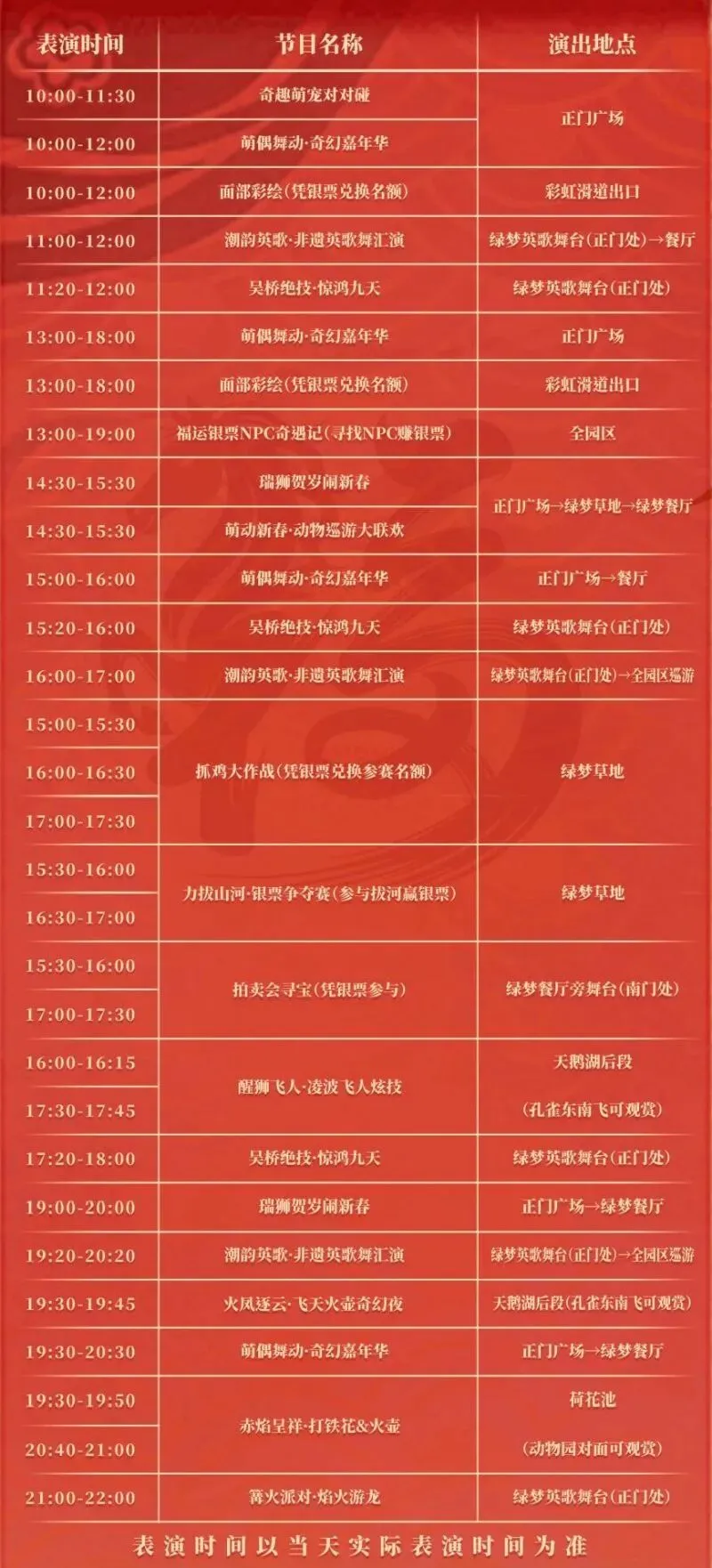 巡游路线:潮悦酒店→水上乐园→南滨广场→幸福农场(其中水上乐园、幸福农场需购票进入)