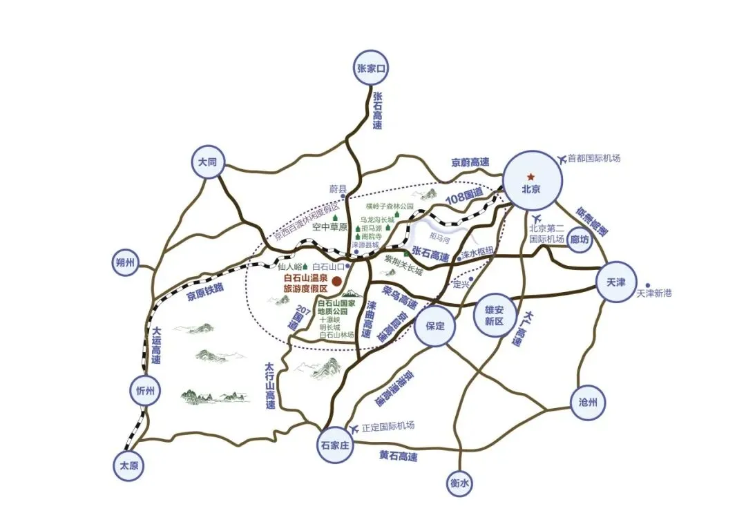 自驾:北京出发驶入京昆高速转荣乌高速,到涞源南下高速沿207国道西行3公里到达白石山温泉旅游度假区。