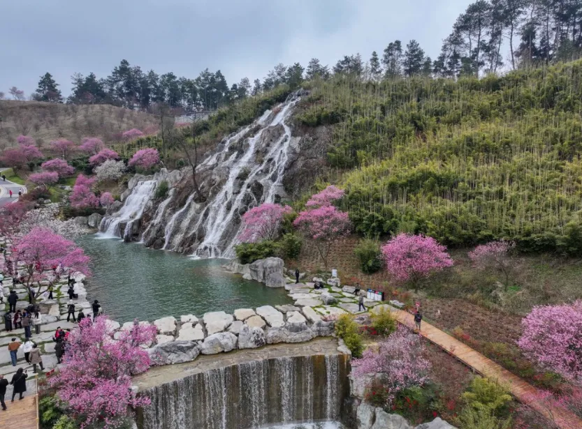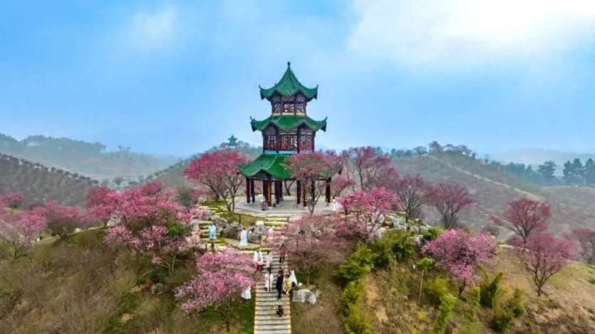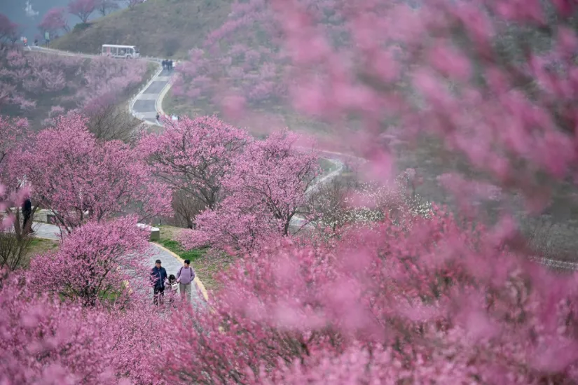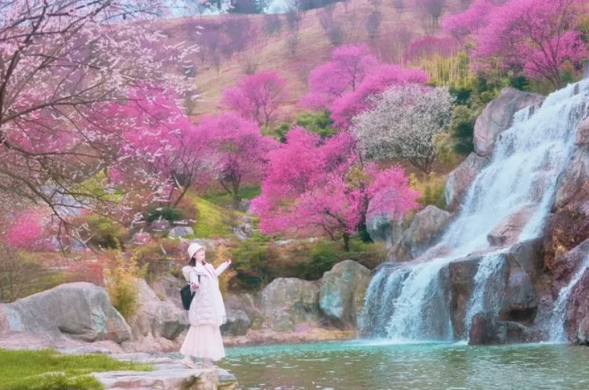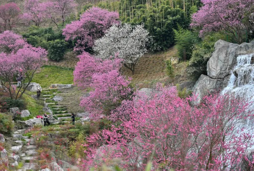 每到立春前后,万株梅花将会全面绽放,漫山遍野,徇烂多彩,走在里面,就像置身于粉色童话世界。