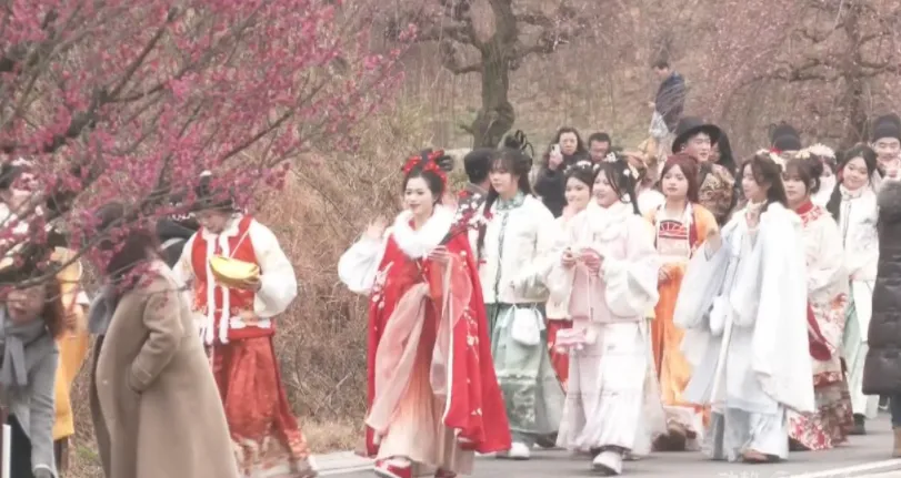 小编还记得,今年梅园刚开始的时,梅园还上演了精彩的国风巡游,身着汉服、手持团扇的小姐姐们衣袂飘飘,穿行于梅林之间,与暗香浮动的梅花相映成趣,宛如画中仙子。