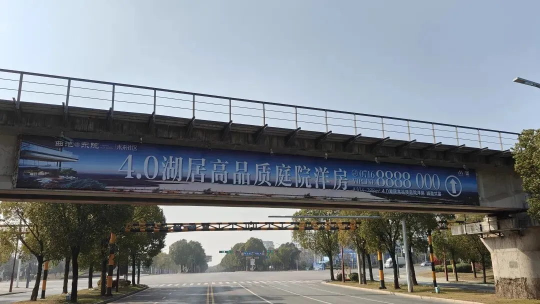 占据文旅区核心交通要道,横跨铁路桥醒目位置,画面超长超震撼,视觉冲击力极强。途经车辆与行人一眼即可捕捉,天然形成强制关注效果,是打造区域品牌地标、快速提升知名度的首选户外媒体。