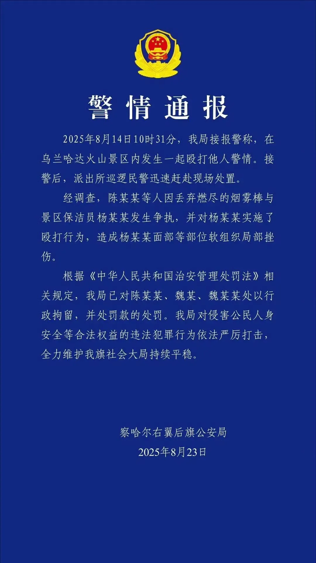 据光明网报道,8月14日,在内蒙古乌兰哈达火山景区,一名68岁的保洁员因劝阻游客不要乱扔烟雾棒,反被游客打成轻伤,引发网友热议。据了解,该景区一直禁止游客使用烟雾棒,但不少游客不仅不听劝阻,使用后也不按规定丢弃,给景区卫生工作带来很大压力。事后经调查,当地公安局对打人者处以行政拘留并罚款。