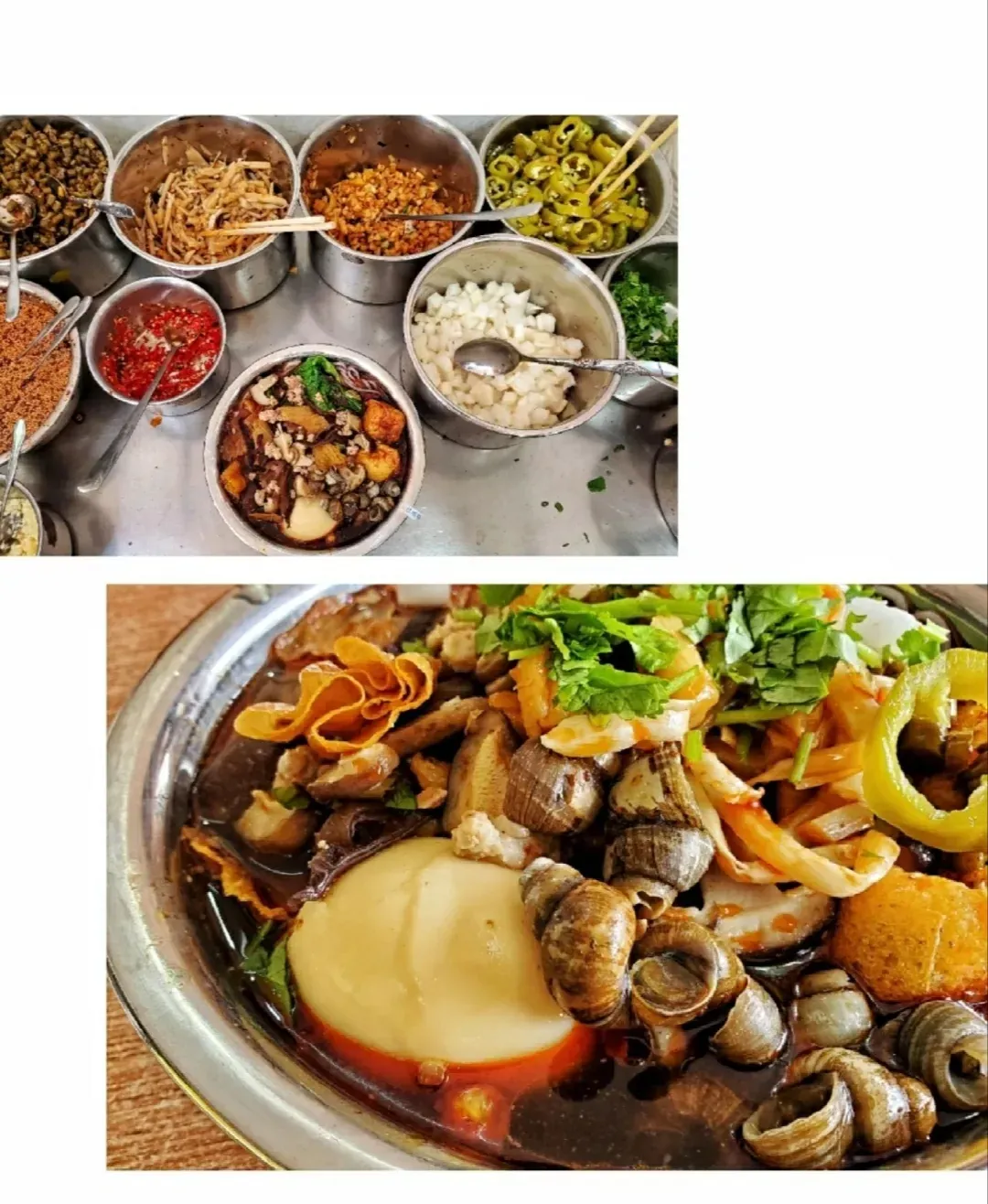 阳朔特色-各种酿,豆腐酿香菇酿节瓜酿等等,而其中最特色的当属田螺酿。广西的田螺个头无比巨大先把螺肉弄出来,再混合猪肉、马蹄、各种调料,而这家还加了芋头,重新塞回去,味道鲜明又清甜!一定要尝尝。