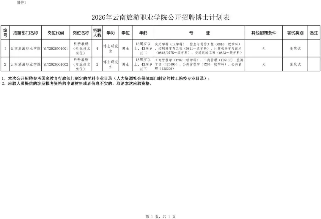 云南省高校招聘 | 2026年云南旅游职业学院公开招聘工作人员简章