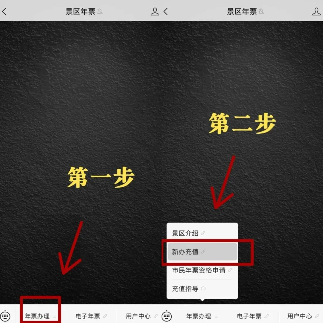 线上可通过微信公众号“景区年票”按照提示新办、充值景区年票。