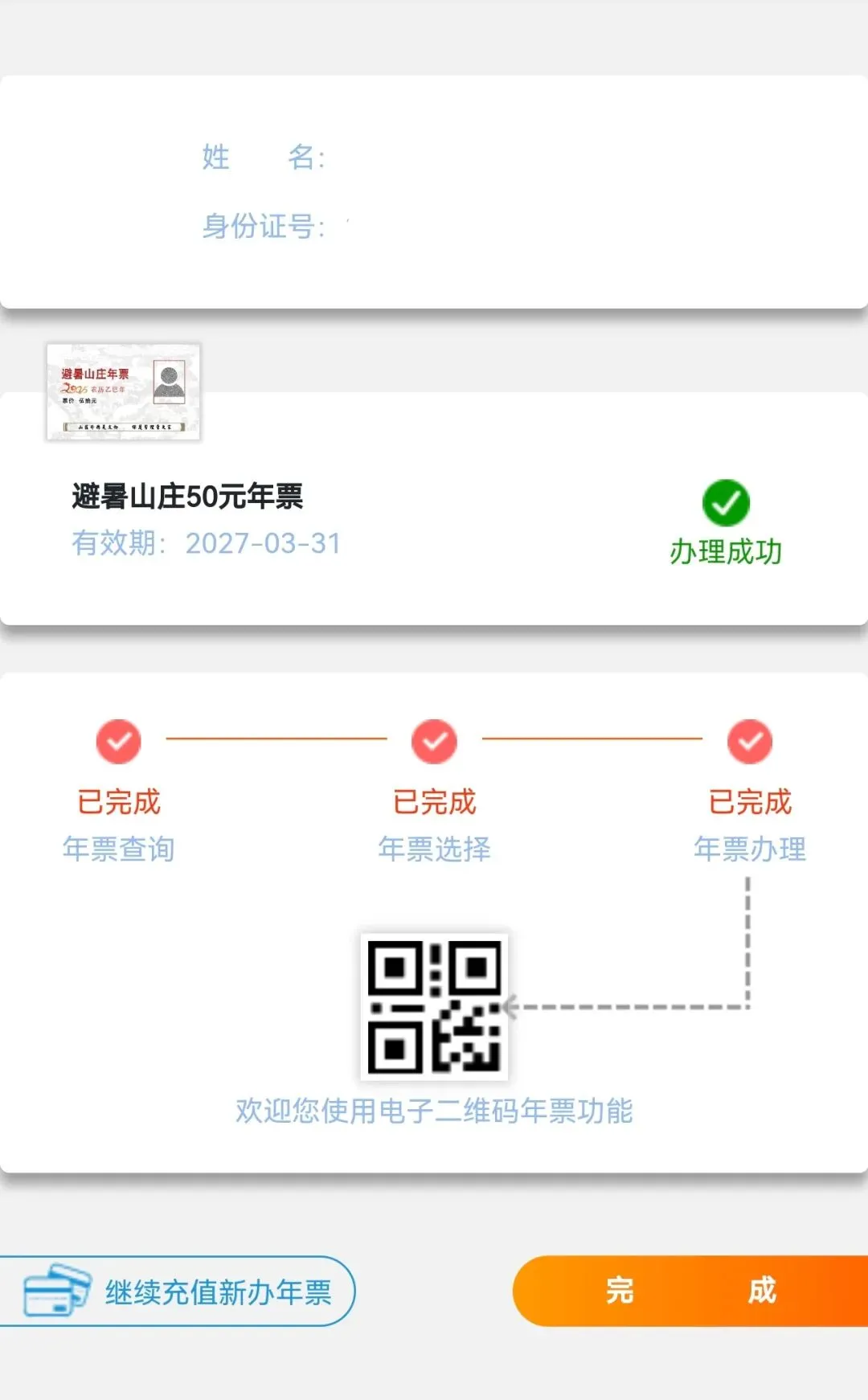 在“景区年票”公众号点击“新办充值”,选择“避暑山庄30元特殊年票”根据提示直接办理即可。