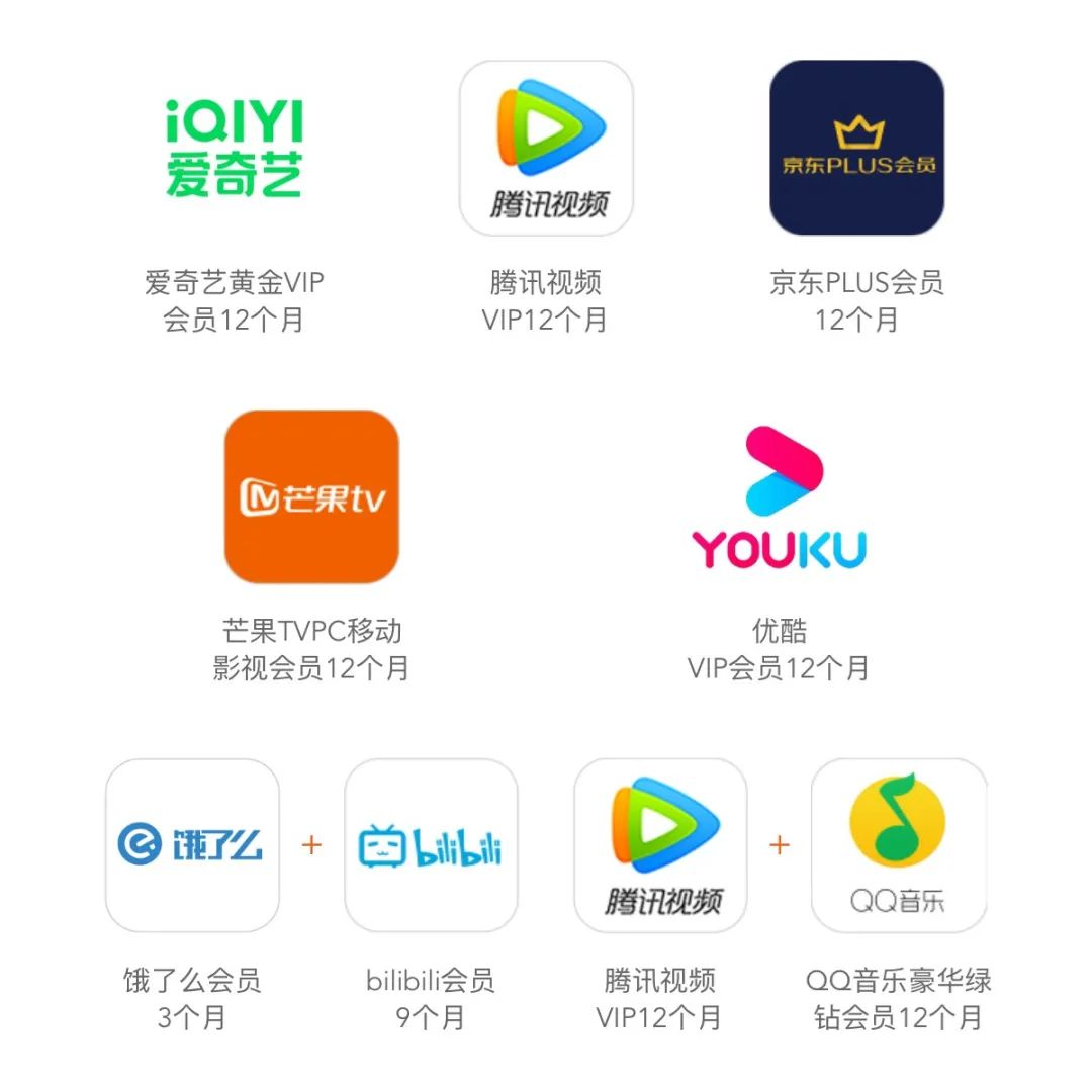 礼品有:京东E卡 20 元、饿了么外卖代金券 20 元、滴滴打车快车 30 元代金券、盒马鲜生 30 元礼品卡、爱奇艺视频黄金会员月卡、优酷土豆黄金会员月卡、腾讯视频 VIP 会员月卡、芒果 PC 移动影视会员月卡