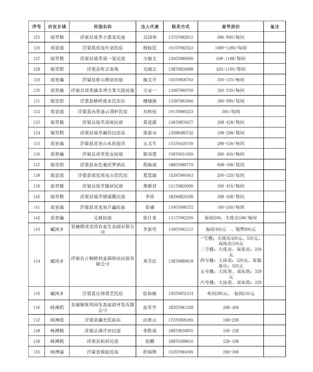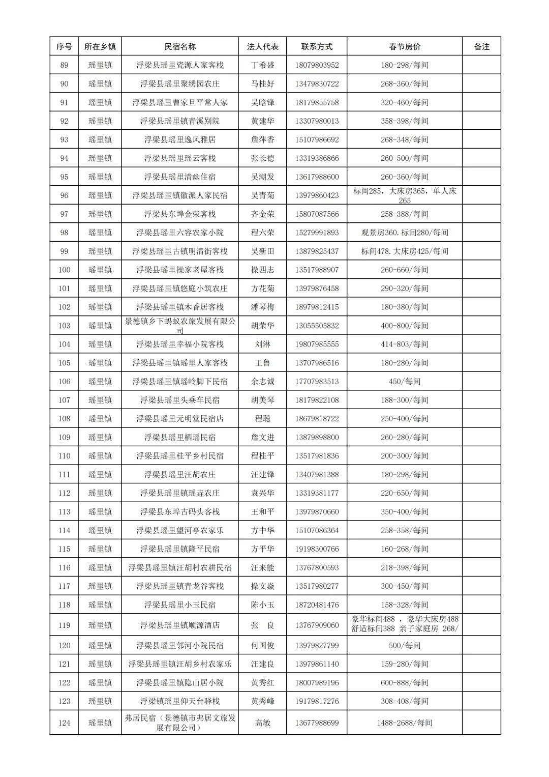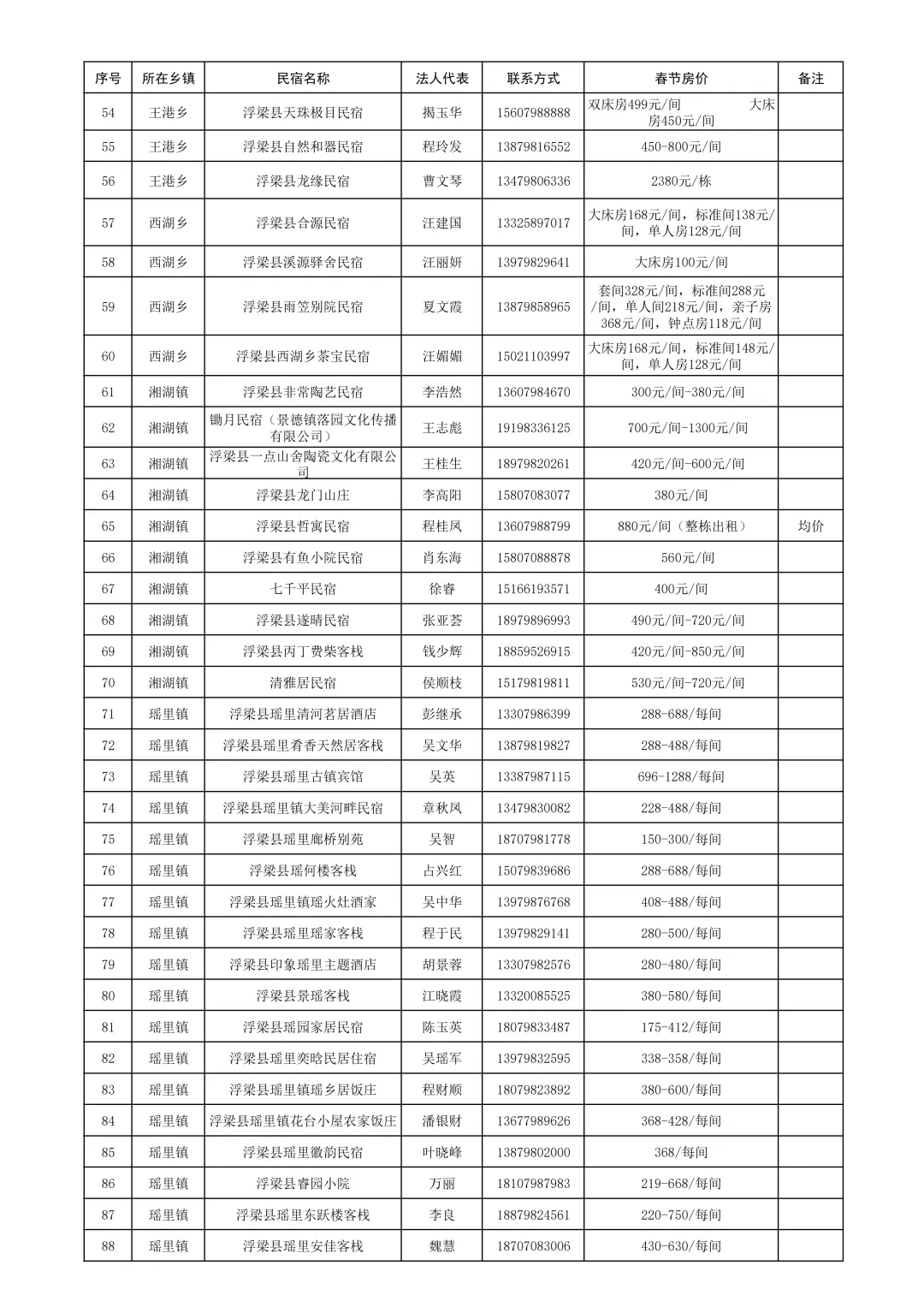 浮梁县旅游民宿春节期间价格公示表