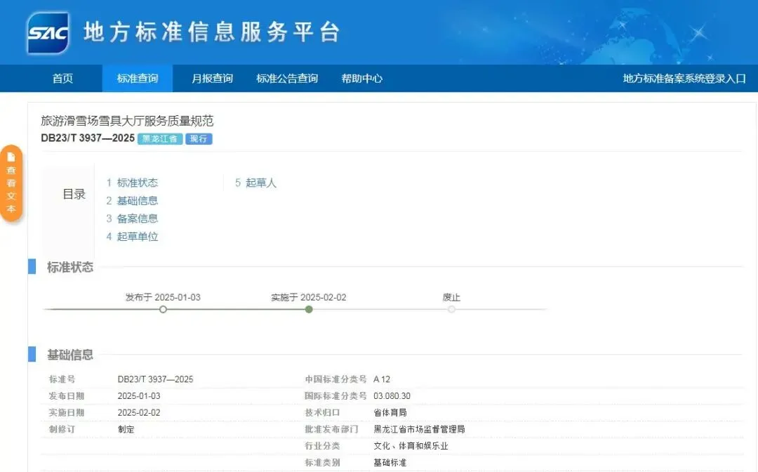 2025年2月25日,黑龙江省市场监督管理局批准发布11项地方标准(备案公告:2025年1号)。其中包括《旅游滑雪场雪具大厅服务质量规范》(DB23/T 3937—2025),此标准自2025年2月2日开始正式实施。