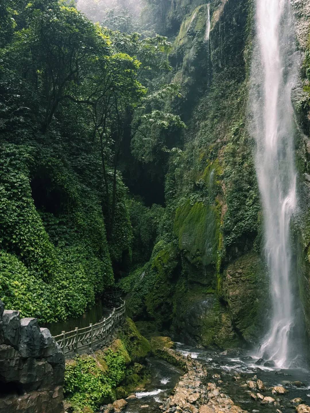 现实版的侏罗纪公园,藏在丛林里的峡谷瀑布,188米的超高落差。如果说德天瀑布给人的感觉是磅礴,这里的瀑布则是可以近距离感受"飞流直下三千尺"的震撼。