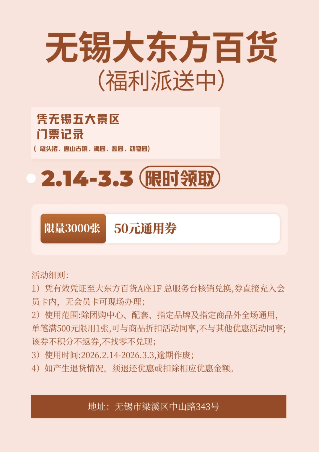 ✅活动内容:凭无锡五大景区门票记录(鼋头渚、惠山古镇、梅园、蠡园、动物园)2.14-3.3限时领取50元通用券(限量3000张)。