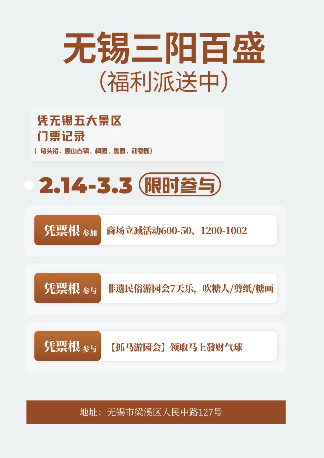 ✅活动内容:凭无锡五大景区门票记录(鼋头渚、惠山古镇、梅园、蠡园、动物园)2.14-3.3限时参与活动。