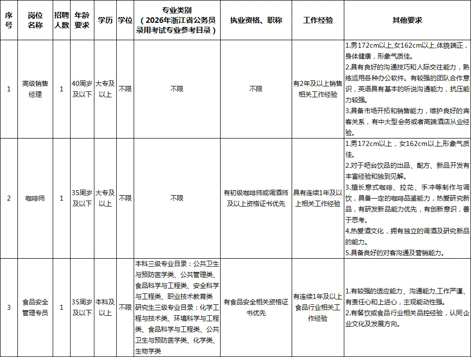 本次共计招聘3个岗位,为高级销售经理、咖啡师、食品安全管理专员,具体招聘人数及要求如下: