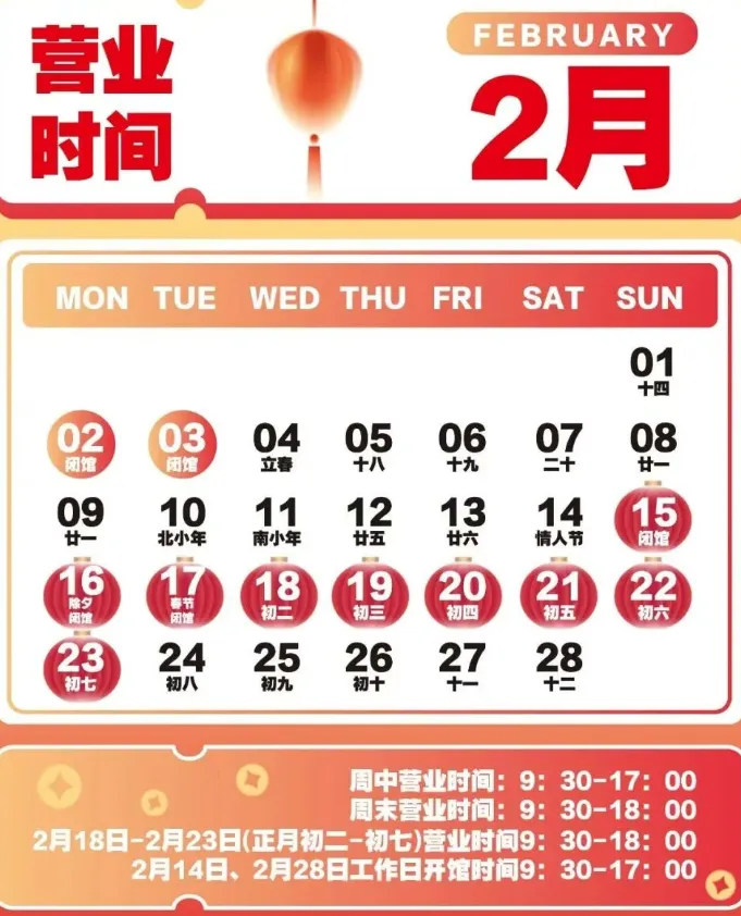 闭馆时间:2月15日(腊月二十八)至2月19日(正月初三)闭馆。