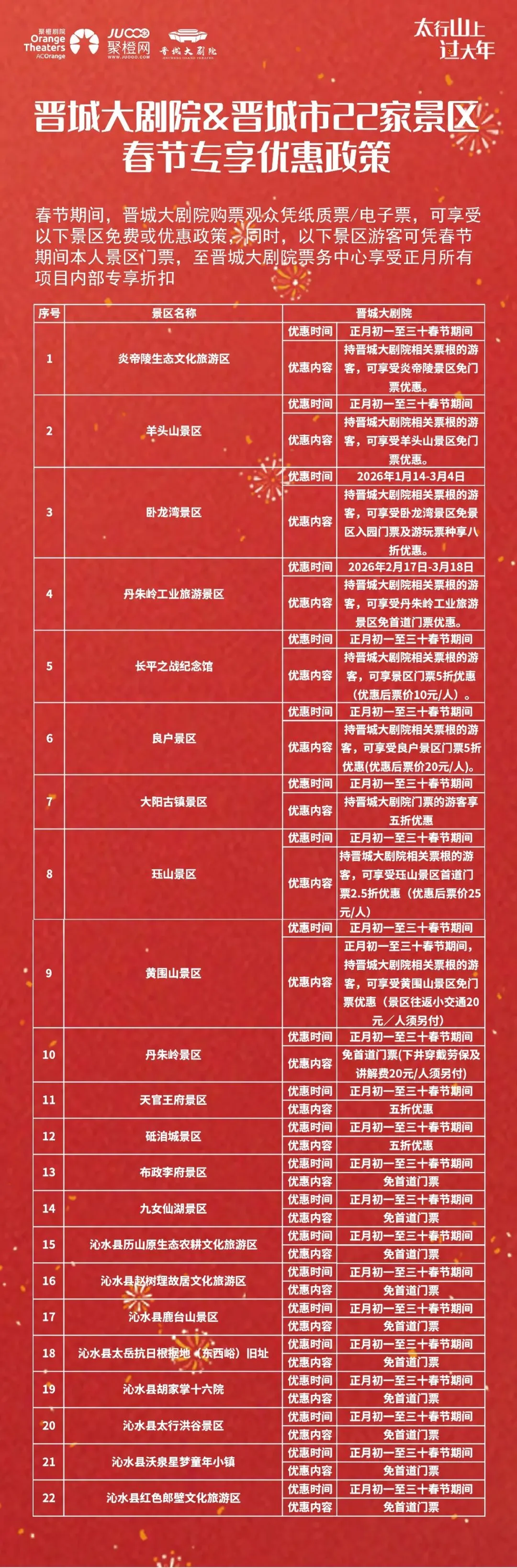春节期间,晋城大剧院与全市 22 家景区联合推出双向优惠政策,福利可叠加使用。让你看演出、游景区一站式尽兴~