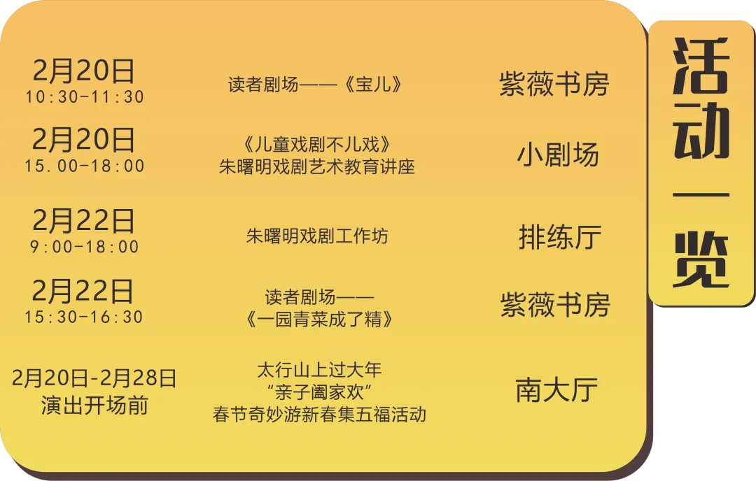 光看演出还不够?“亲子阖家欢” 春节奇妙游艺术盛宴,还有超多互动活动让快乐翻倍!大剧场+小剧场+紫薇书房同步联动,专业戏剧讲座、沉浸式工作坊带你解锁艺术小知识,读者剧场让娃亲身参与剧情演绎,还有贯穿全程的新春集五福活动,零门槛参与,轻松赢取实用好礼,大人小孩都能玩得尽兴~