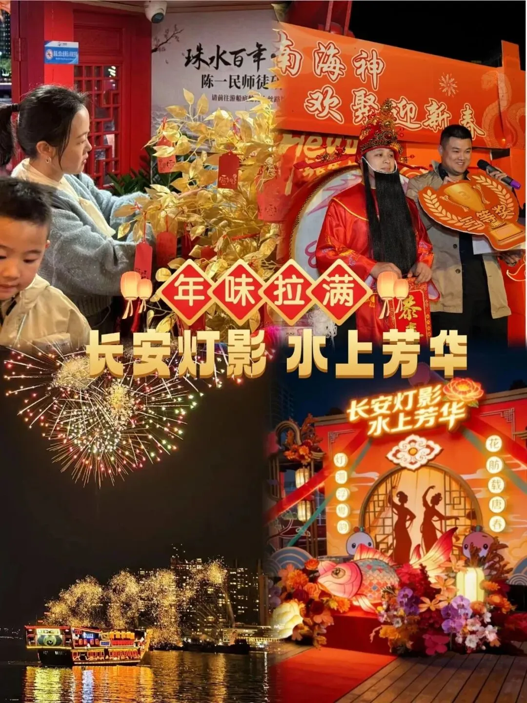 活动内容:结合大年初一白鹅潭烟花汇演,对鹅潭印象号、南海神号、广汽号、远海启航号4艘游船量身打造沉浸式主题活动;并安排民俗文化表演、新春许愿祈福、非遗项目互动等体验内容,串联烟花观赏环节,打造“水上+文化+视觉”的复合型春节体验。