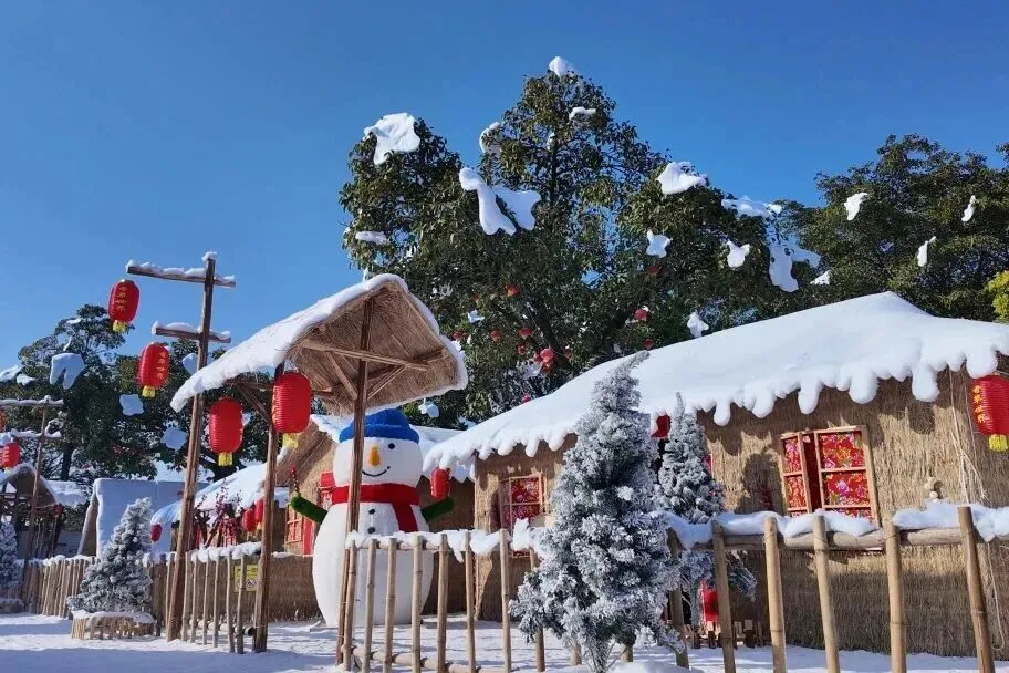 全新开放的雪乡小镇,实现“看雪自由”,厚厚的仿真积雪压着木屋屋檐红灯笼随风摇晃。
