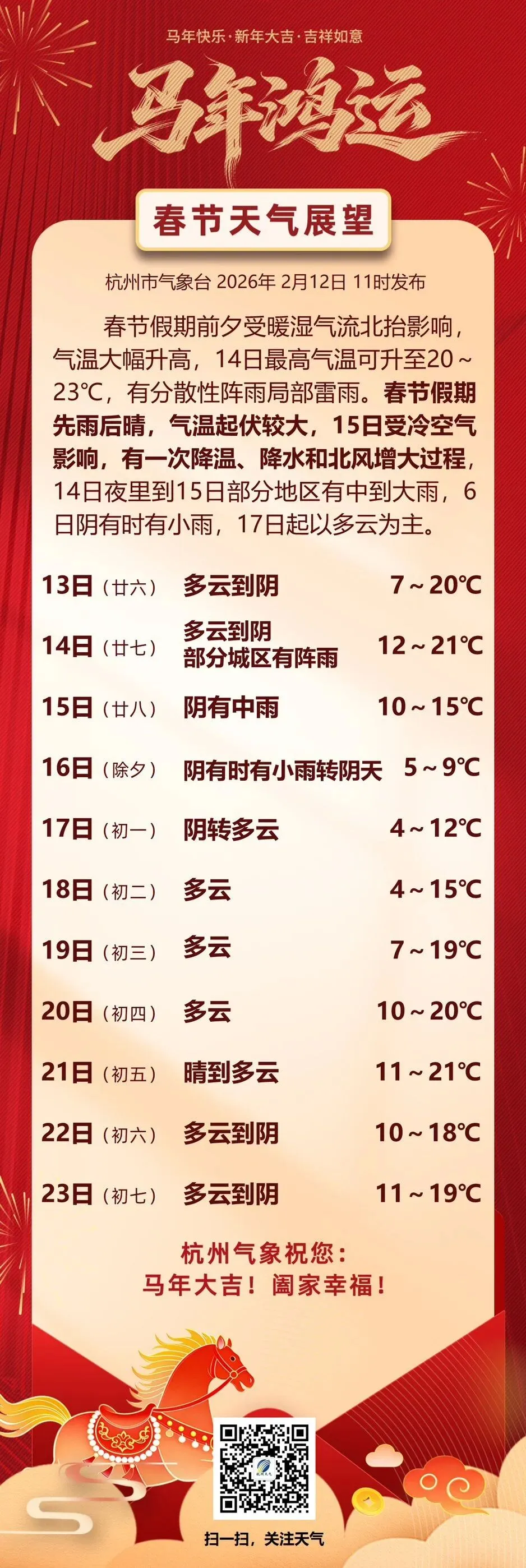 预计春节假期先雨后晴,气温起伏较大,请市民游客注意保暖。