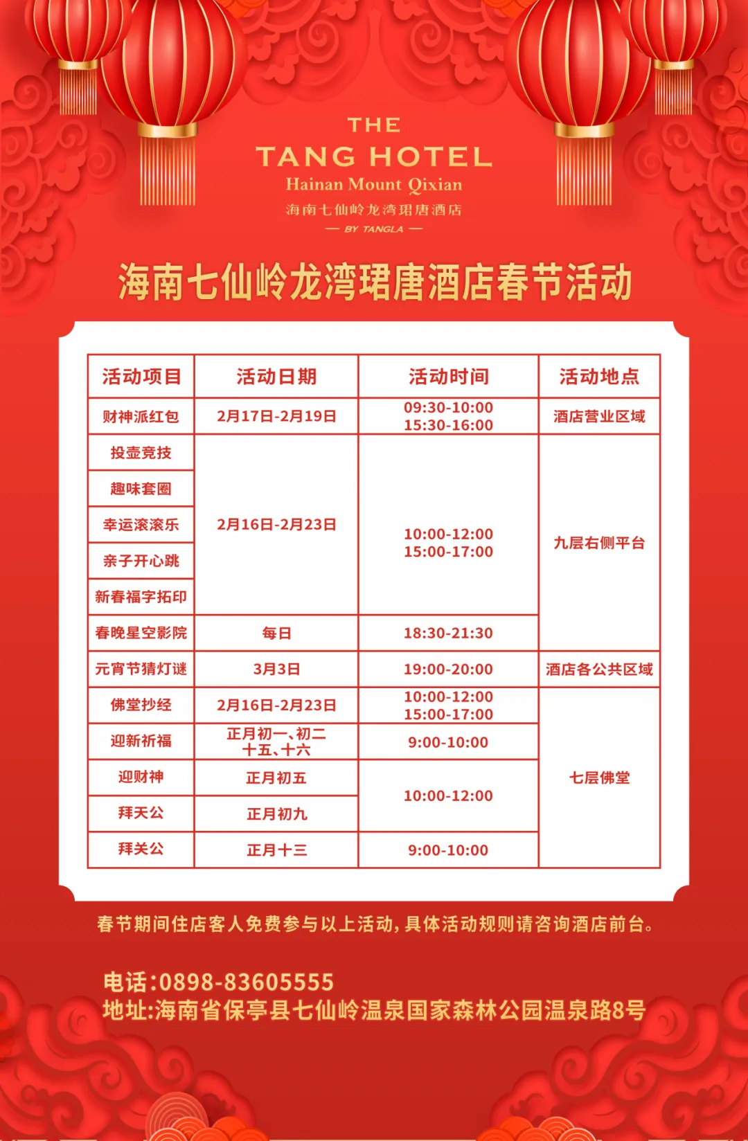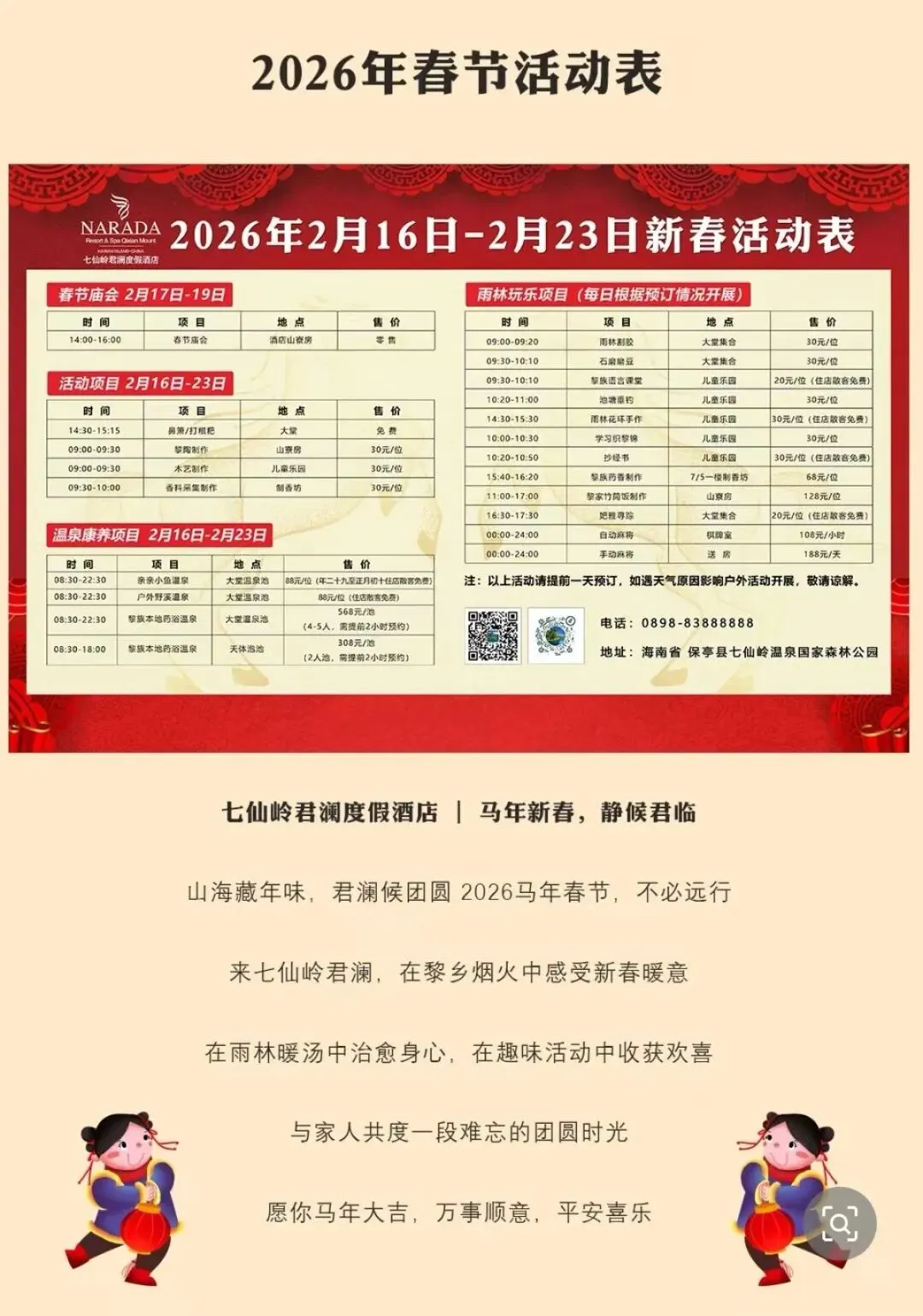 1、赠送除夕当天免费泡树上鸟巢温泉(以预定套餐标准人数赠送) 温泉开放时间:上午10:00-16:002、免费参加雨林仙境辞旧迎新春节联欢晚会: