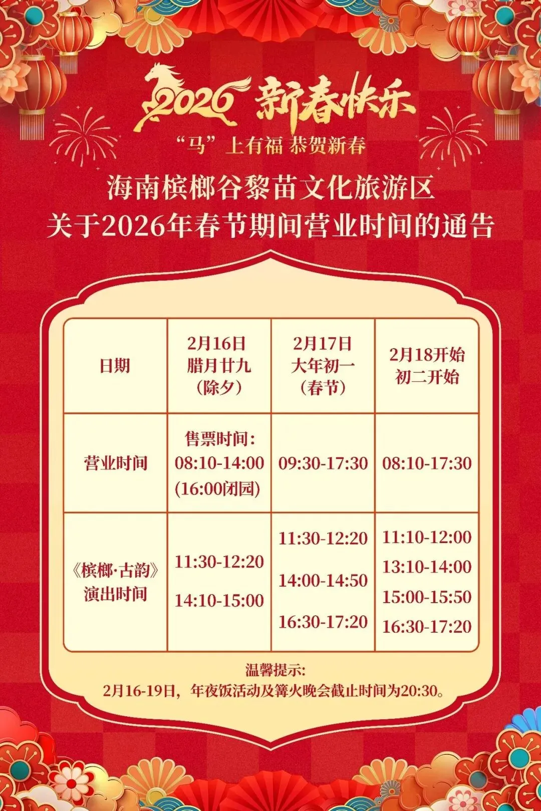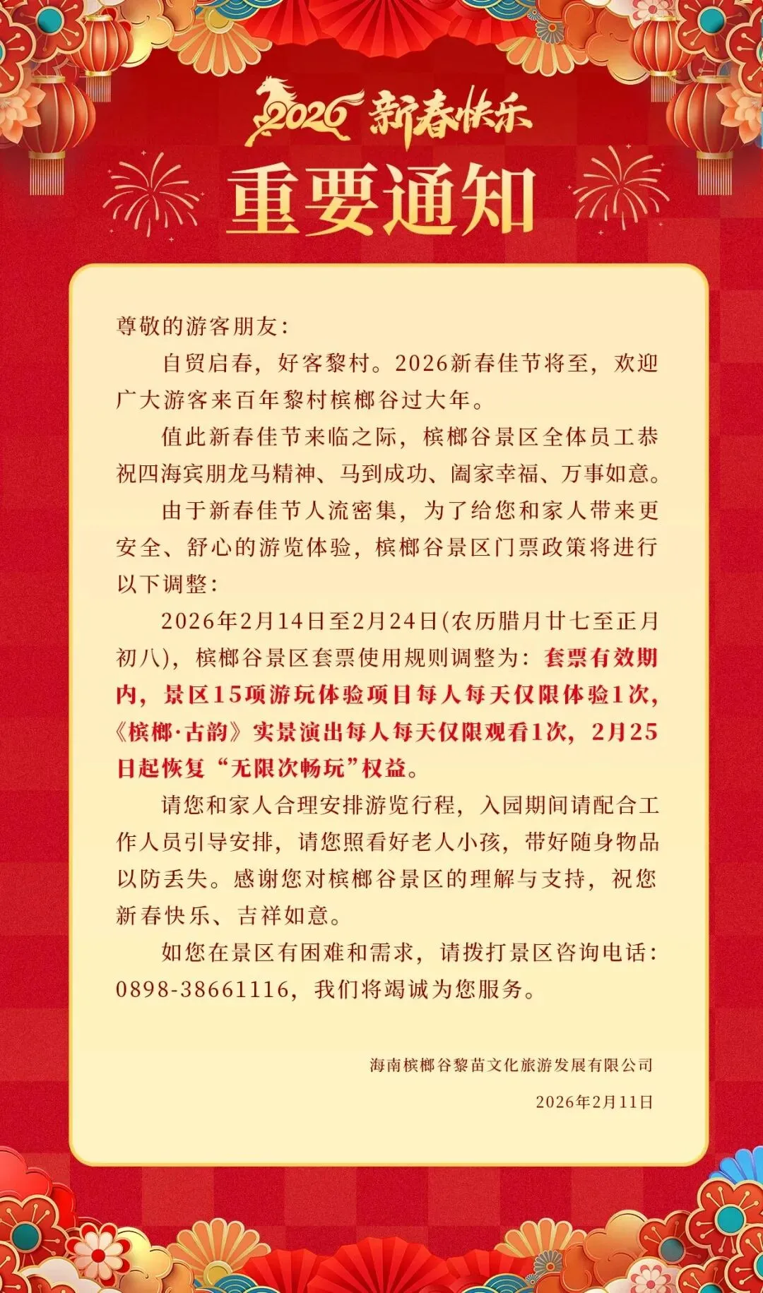 槟榔谷调整春节期间运营时间和套票政策
