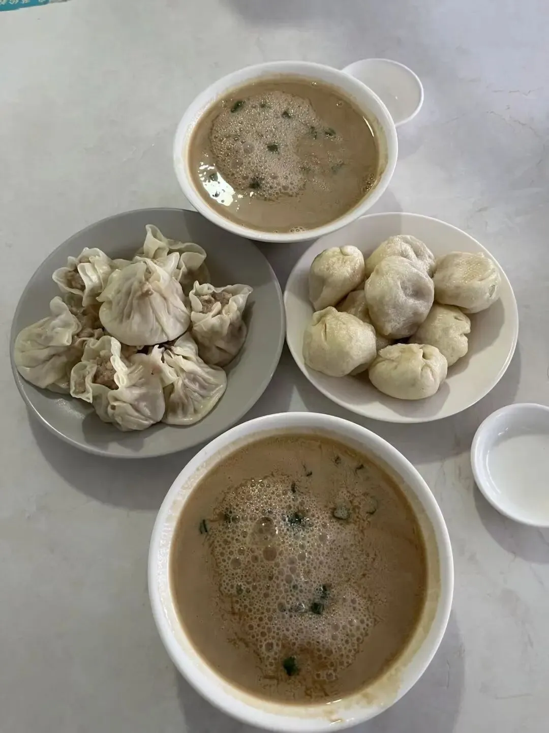 他们家的汤包是老面汤包,上面的皮很薄,下面的底包有一点点厚,包子馅调得挺好吃,肉很嫩,再配上咸豆浆,味道绝了。还可以尝一下烧麦。