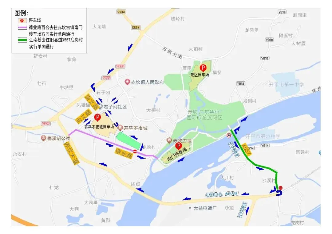 1、德业路百合去往赤坎古镇南门停车场方向实行单向通行。 2、江南桥去往旧县道X557底岗村实行单向通行。 3、新区一路(崇文路)去往开平不夜城方向实行单向通行。 4、市区去往开平不夜城、古镇南门停车场、赤坎镇江南方向的车辆可由G325国道转入崇文路,经尚义路、德业路前往。 为方便广大游客停车,前往赤坎华侨古镇景区的游客可在赤坎华侨古镇景区停车场(提供停车位2200个)、古镇景区南门停车场(提供停车位3600个)及周边村庄内停车。前往开平不夜城景区的游客可在不夜城停车场(提供停车位3600个)停车。 请前往赤坎华侨古镇景区、开平不夜城景区游玩的游客提前根据当日景区附近交通情况,合理选择交通出行路线。 祝广大游客春节快乐,平安出行! 赤坎镇人民政府