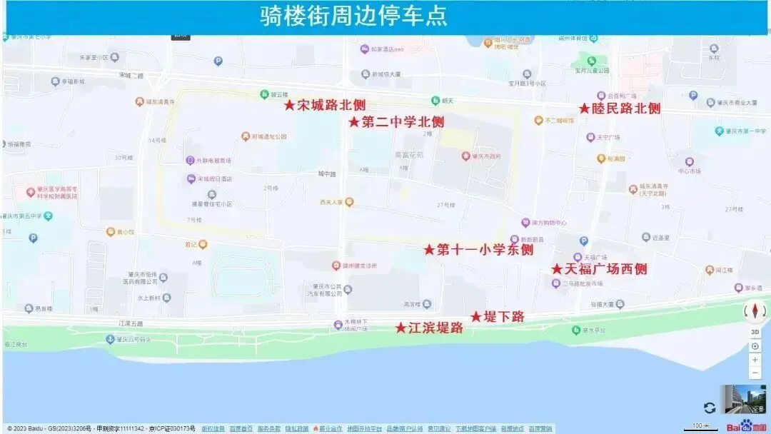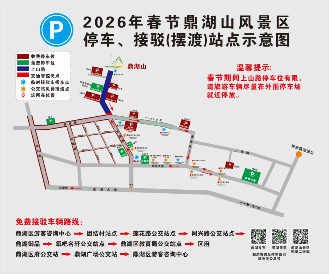 2.临时免费停车点:市农校停车位100个、体育公园停车位300个、鼎湖区政府停车位300个、鼎湖区人社局停车位40个、鼎湖区地税局停车位80个、坑口街道办事处停车位30个、小计850个。