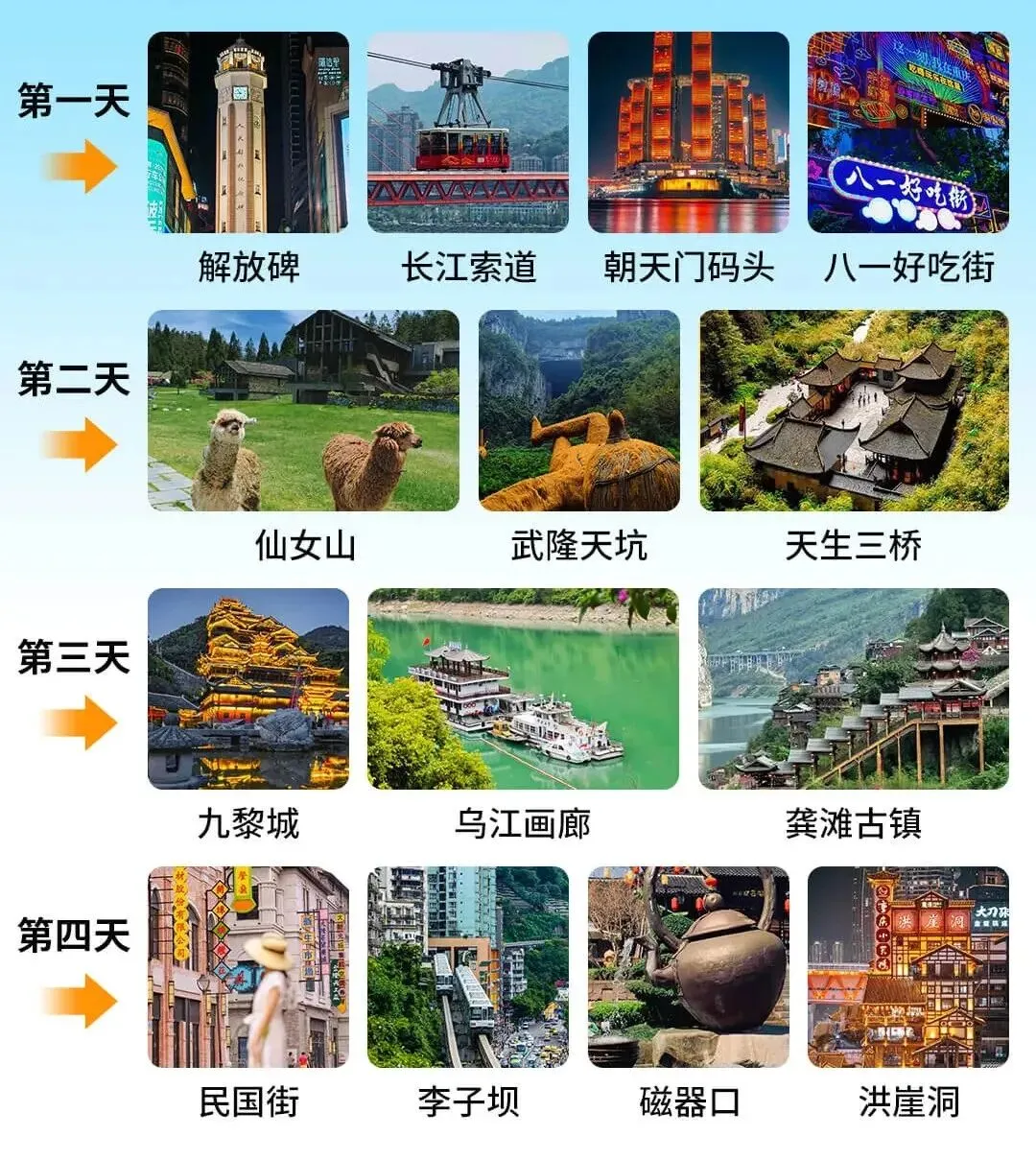 重庆4天3晚游玩行程安排: ☀DAY1 各地-重庆接机✈/接站(入住后自由活动) ☀DAY2 前往武隆-【天生三桥】-【仙女山国家森林公园】 ☀DAY3 前往【九黎城】-【乌江画廊】 ☀DAY4 【古镇磁器口】-【轻轨穿楼】-【洪崖洞】-【解放碑】 -结束行程