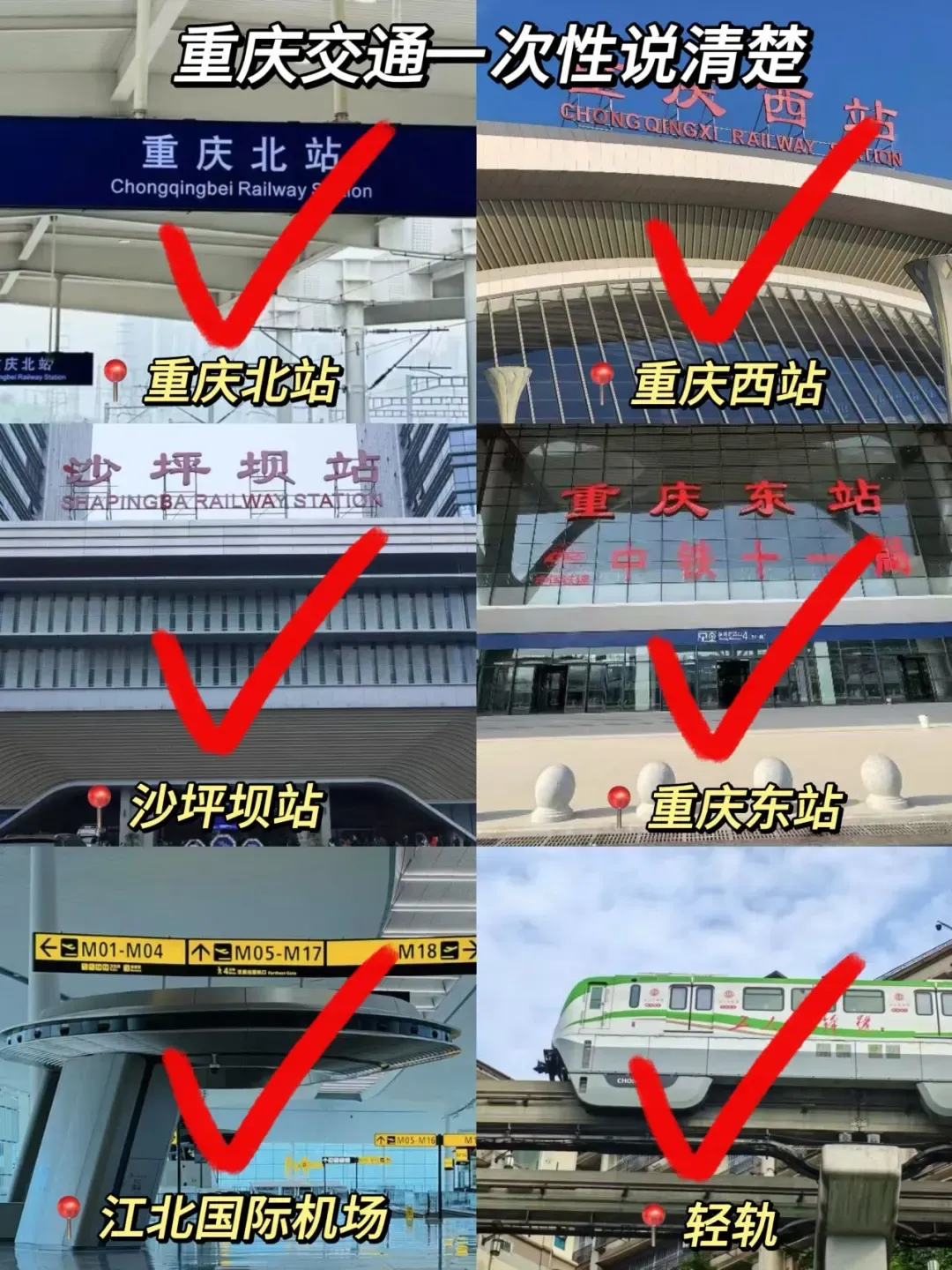 重庆主要的交通枢纽包括江北国际机场、重庆北站、重庆西站和沙坪坝站