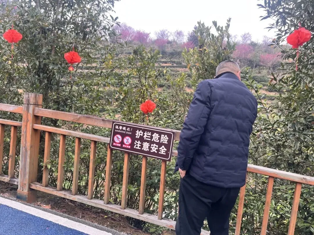 2月12日,乡党委宣传委员周明华带队,对景区观景台、游览步道等重点区域安全防护设施进行细致检查,现场查看步道护栏牢固情况。对排查发现的不牢固护栏,第一时间安排人员张贴警示标识并进行修缮加固,全力保障游客游览环境安全舒适。