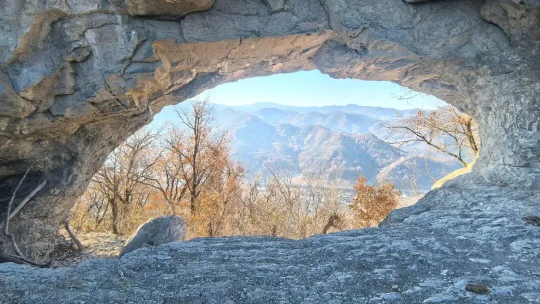 山顶横亘着一道200米长的巨型石屏峰,历经亿万年的地下水溶蚀与季风风化,石屏中央被生生凿出一个宽20米、高十余米的天然拱形巨窟,人称“天眼”。并非只有一个孔洞,周边还散落着几处大小不一的小窟窿,构成了独特的“群眼”景观。落日熔金的时刻,是这里的黄金拍摄期:斜阳穿越大窟窿,在对面的崖壁投下流动的光斑,群山层林尽染成橘红与绛紫,风穿窟窿而过,发出低沉的呼啸,仿佛大地的呼吸。民间更盛传薛仁贵征东时,见敌军凭险据守,弯弓搭箭,一箭射穿山崖,敌军军心大乱,唐军大胜的豪迈传说;也有杨二郎担山赶太阳的民间故事,为这方奇景蒙上了一层浪漫的侠气与神话色彩。
