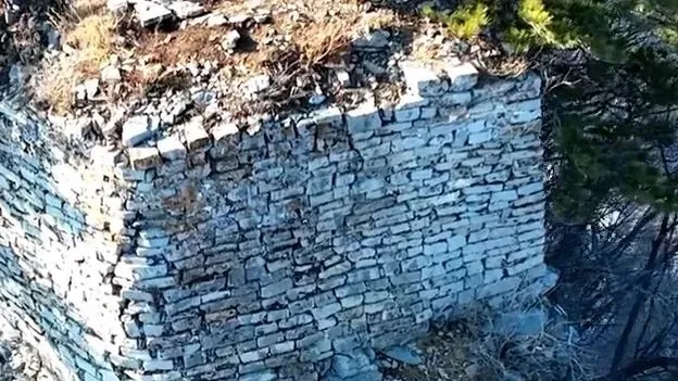 距离“天眼”仅300米,一座明代石砌瞭望台(省级文物保护单位)紧贴崖壁巍然矗立。这座7.2米长、5.5米宽、数米高的石构建筑,是辽东边墙防线的烽火前哨。石墙虽历经数百年风雨侵蚀,部分墙体有风化剥落,但基石依旧稳固,登台远眺,连绵的辽东群山尽收眼底,松涛阵阵,恍惚间仿佛还能听见当年戍边将士的呐喊与狼烟升起时的警报声。这里曾是明代监视建州女真动向的关键节点,每一块青石板都镌刻着辽东边防的烽火岁月。