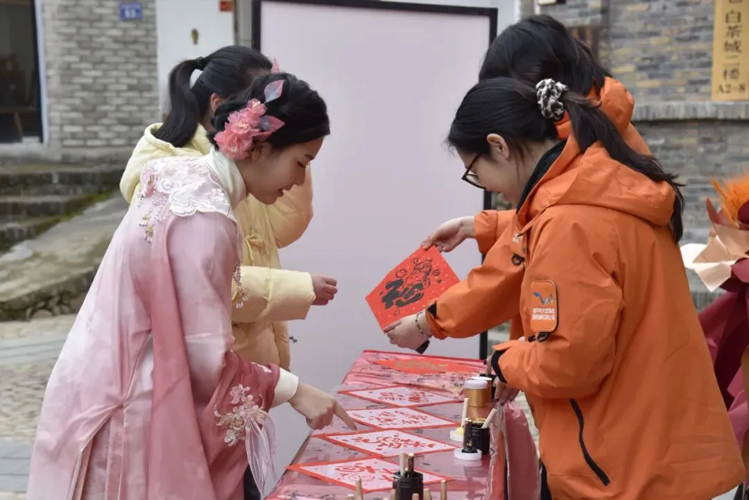 景区内精心打造的八大福气点位各有特色,成了游客打卡游玩的好去处。游艺区里,投壶、套圈等传统民俗游戏趣味十足,欢声笑语此起彼伏;拓印区长桌之上,骏马、福字主题模板整齐排列,大家亲手拓印,把新春福气带回家;文墨区更是墨香满溢,书法爱好者与游客挥毫泼墨,书写福字、春联,传递新春美好祝愿。游客们穿梭在各个点位,与国风 NPC 趣味互动集章,还在 “石圳” 打卡墙、“发财” 互动墙等特色场景前拍照留念,定格新年美好瞬间。