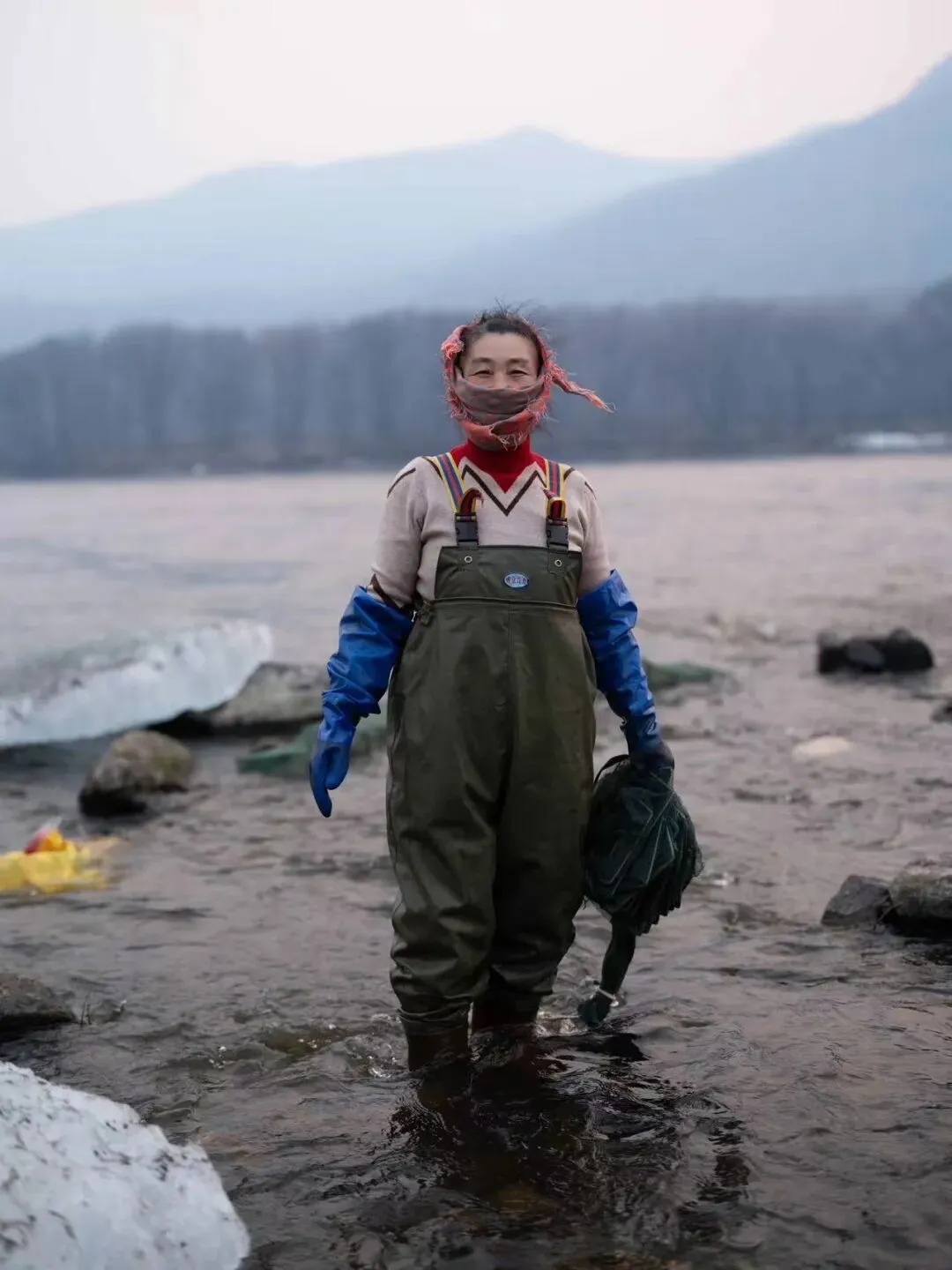 雾散尽后,天是北方冬天透净的蓝。河两岸的树全裹着雾凇,每根枝条都挂着厚厚的冰,白得发亮。雪地、树林、河水,只剩下蓝色、白色和灰色。雪没过小腿,姚璐沿着河岸,一步一步往前走。