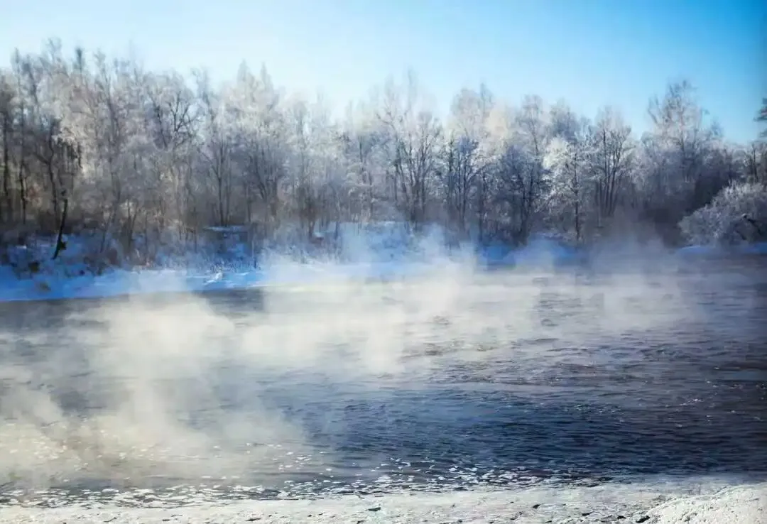 它的上游有水库,4℃的水不间断地流入,库尔滨河才罕见地成为一条“不冻河”。河水与极寒空气相遇,蒸腾出绵延不绝的雾气,遇到冰冷的树枝,便凝结成雾凇。