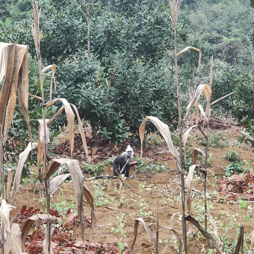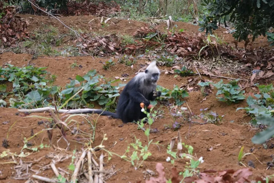 过了一两个小时,我们终于等到了一只比较大胆的白头叶猴,我们到的时候,他正拿着一个地瓜津津有味地吃着,吃完了,又自个儿刨了一个大地瓜🍠继续吃。他的胆子真的特别大,离我们几乎只有5m,大家都不敢说话,也不敢再靠近,深怕惊到它。我在一个角落悄悄地拍下了它吃地瓜的所有细节,但很可惜没有拍到金黄色的小猴子。