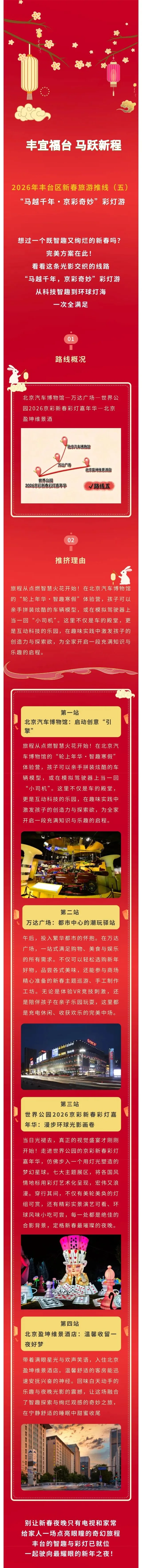 您现在的位置是:首页 > 国内旅游目的推荐 > 正文 国内旅游目的推荐 【马年游丰台】新春主题旅游线路推荐:“马越千年,京彩奇妙”彩灯游 admin2026年02月12日 23:22:50国内旅游目的推荐6 【马年游丰台】新春主题旅游线路推荐:“马越千年,京彩奇妙”彩灯游往期推荐春节来丰台找“马”,图书馆寻马找福啦,在墨香书海中探寻“马”迹春节邀约——来卢沟桥与石狮共度新春【马年游丰台】新春主题旅游线路推荐:“冰雪奇缘·活力趣玩”亲子游来源:产业发展科通讯员:姜楠 转载请说明来源于"旅荐网",部分内容转载自网络,如有侵权请联系qlwl@foxmail.com删除 本文地址:https://www.15386.cn/post/104065.html 上一篇 万里长城西端嘉峪关故乡,爱旅游观赏美景 下一篇 2026年丽江文化旅游学院招聘126名【医疗教师52名】 相关文章 2026年3月18日海南旅行机构信誉档案 2026年安心出游完整名录 桂林四天三晚自由行攻略 隽健旅行vlog|����槟城怎么玩?跟着我 一个人,云南旅行26天攻略(详细版) 马蜂窝发布2026AI+旅游报告:AI搜健康卫士出行包,解锁春季无菌 大同一日游攻略 | 云冈石窟、应县木塔、悬空寺一站式游玩 5 座免费宝藏古镇旅行指南!人少景美不花钱 2-3月旅游攻略.春天就去这些地方吧 时间旅行指南(2):什么是第一本真正意义上的时间旅行科幻作品? 3-4月旅游推荐! 发表评论 取消回复 评论列表 这篇文章还没有收到评论,赶紧来抢沙发吧~