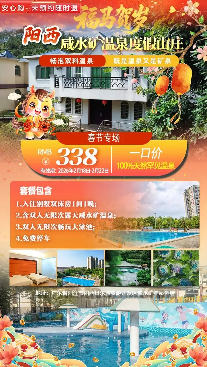 【阳西·咸水矿温泉·旅游度假山庄】春节专场一口价!338元抢山湖别墅双床房+无限次爽泡露天咸水矿温泉+泳池+免费停车!