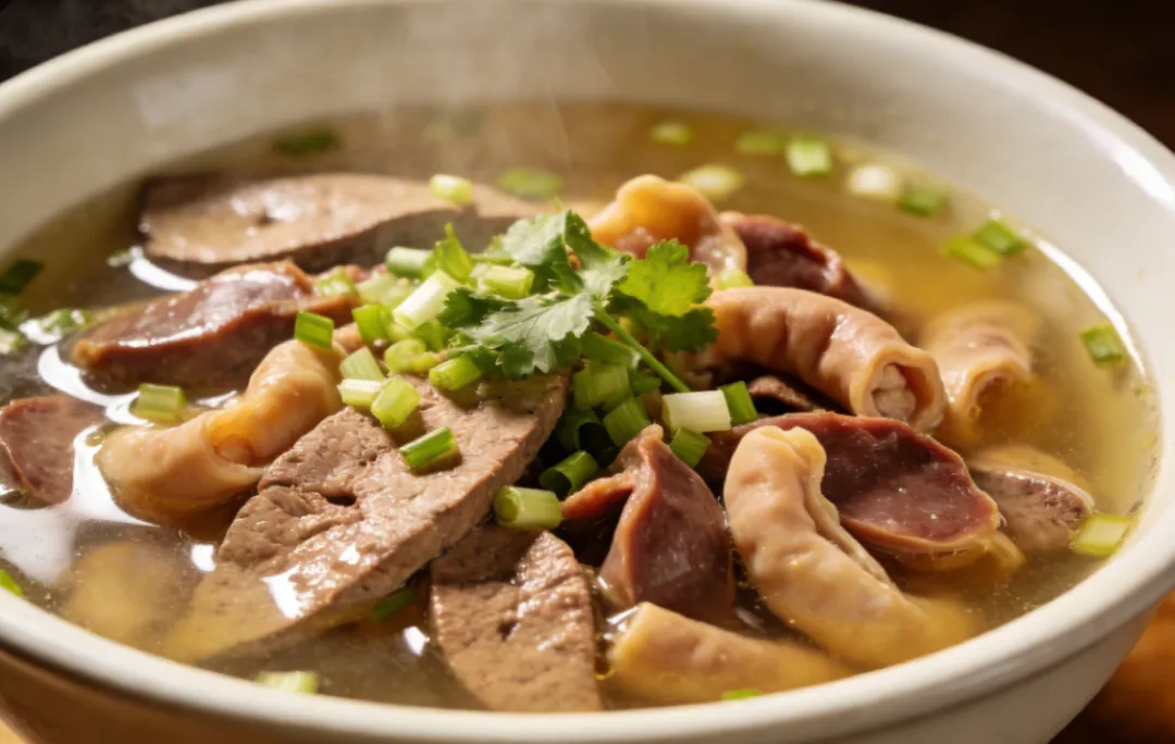 一碗幌子汤端上桌,鲜香直冲鼻腔。猪血入口即化,内脏软烂不柴,汤汁醇厚不腥。按照罗田习俗,煮好的幌子汤要先分给左邻右舍,这碗滚烫的汤,盛着的不仅是美味,更是乡里乡亲间最质朴的温情。