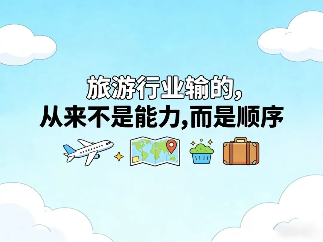 细数那些在旅游行业失败的人,他们大多不缺努力、不缺聪明、不缺基础资源,输就输在做事的顺序完全错了。 一上来就闷头做产品、拼低价、扩规模,却从来没认真想过: 我到底适不适合这个行业? 我凭什么让客户选择我? 我打算在这个行业深耕多久? 当这三个核心问题没有答案时,所有的埋头努力、盲目投入,都只是在加速失败。 入行旅游,一定要慢。不急于开单、不急于囤货、不急于求成,而是先明确边界:哪些钱不能赚、哪些单不能接、哪些方向不能碰。 旅游行业从来不缺风口与机会,缺的是能长期活下去的人。 而活得久、走得远的底气,从来不是运气,而是从第一天起,就把方向走正、把根基扎稳。