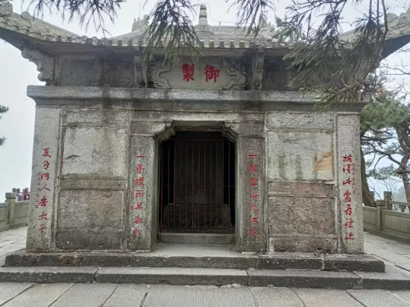 御碑亭迄今已有600多年的历史,属石构建筑,4个檐角高耸,角上雕有龙、鱼等精美图案。石亭正门有两副对联。一副“姑从此处寻踪迹,更有何人告太平”说的是周颠的故事。另一幅“四壁云山九江棹,一亭烟雨万壑松”描绘的是此处美景。亭中竖立的汉白玉御碑,高3.6米,宽1.3米,厚0.2米,重达数千斤,碑石正额刻有“御制”二字,下刻朱元璋撰写的《周颠仙人传》,共二千零八十余字,石碑背面刻有朱元璋的两首诗,由书法家詹希原书写。