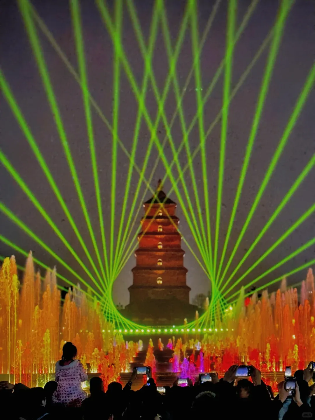 白天看古塔巍峨,傍晚逛大雁塔广场,等到夜幕降临,北广场的音乐喷泉(水舞灯光秀)准时上演,泉水随音乐起伏,搭配灯光和古塔倒影,美到失语,春节期间还有限定灯光效果。