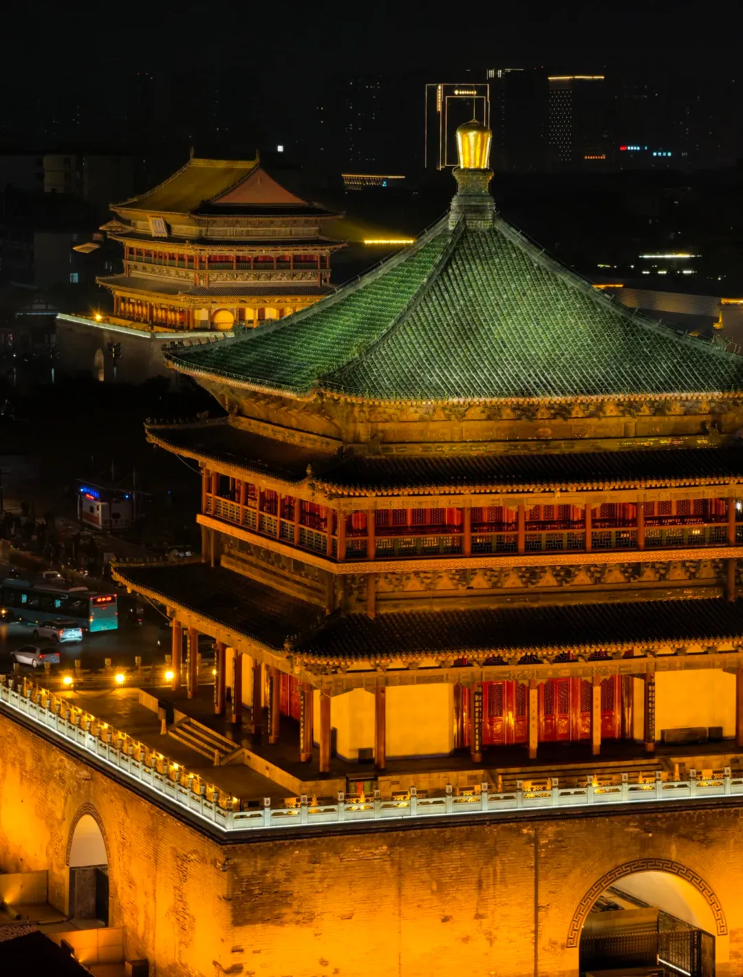 春节期间,钟鼓楼会悬挂红灯笼,年味十足,登楼远眺,能俯瞰整个西安城的风貌,感受古城中轴线的厚重与热闹。