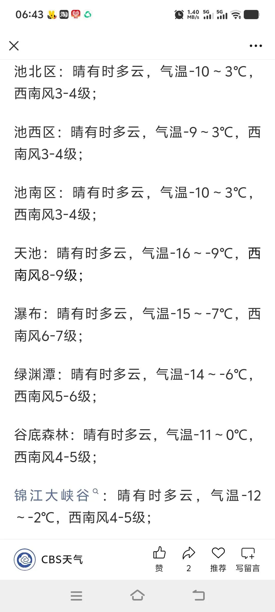 ➡️北景区天池主峰,风力较大,公路、栈道积雪结冰,不具备安全运营条件,天池景点全天关闭。其他景点正常开放,视天气情况随时关闭。 ➡️西景区天池景点,正常开放,视天气情况随时关闭。粉雪谷、锦江大峡谷景点,正常开放,视天气情况随时关闭。 ➡️南景区关闭。