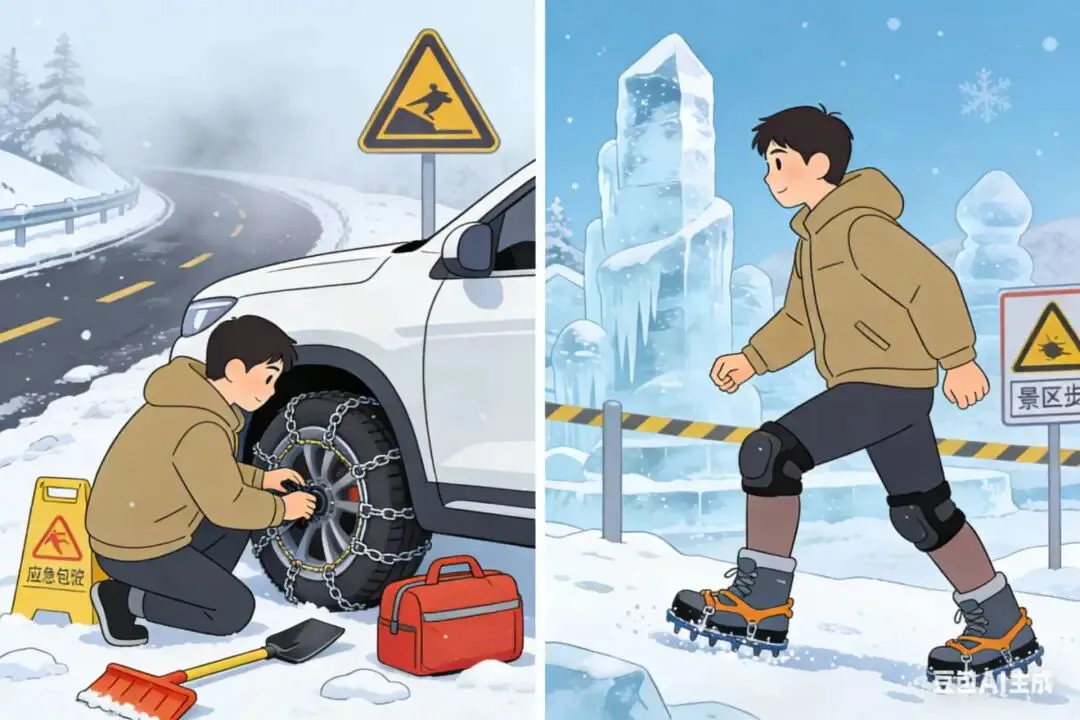 在景区冰雪路面行走时,穿防滑性能好的鞋子,行走时膝盖微屈、重心前倾,稳步慢行,不追逐打闹;经过冰雕、雪塑、护栏等设施时,保持安全距离,不触碰、摇晃,防止坍塌、磕碰受伤;留意景区内的警示标识,不翻越、不靠近危险区域。