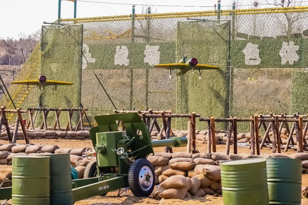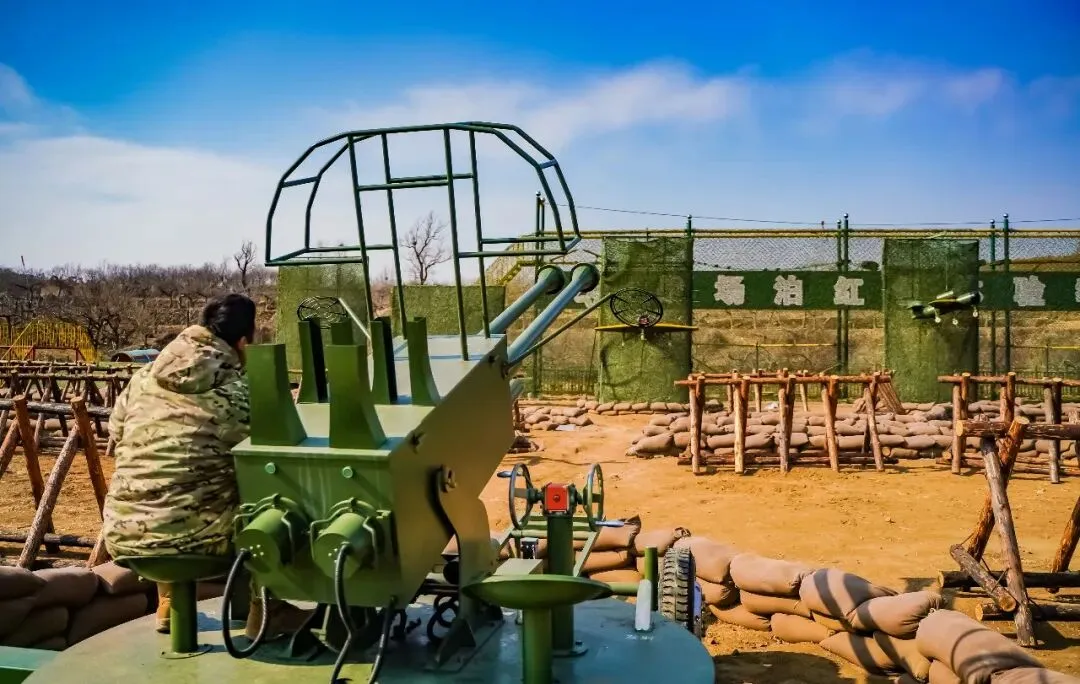 榴弹炮阵地: 学习身管火炮知识,在教练指导下,亲手拉绳,向目标发射“水炮弹”,体验曲射火力的打击快感。