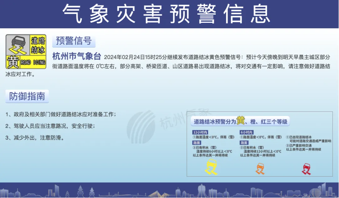 杭州市气象台今天15时25分继续发布道路结冰黄色预警信号: